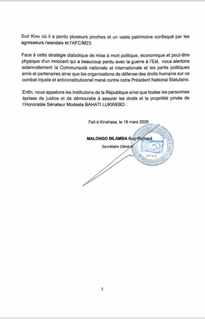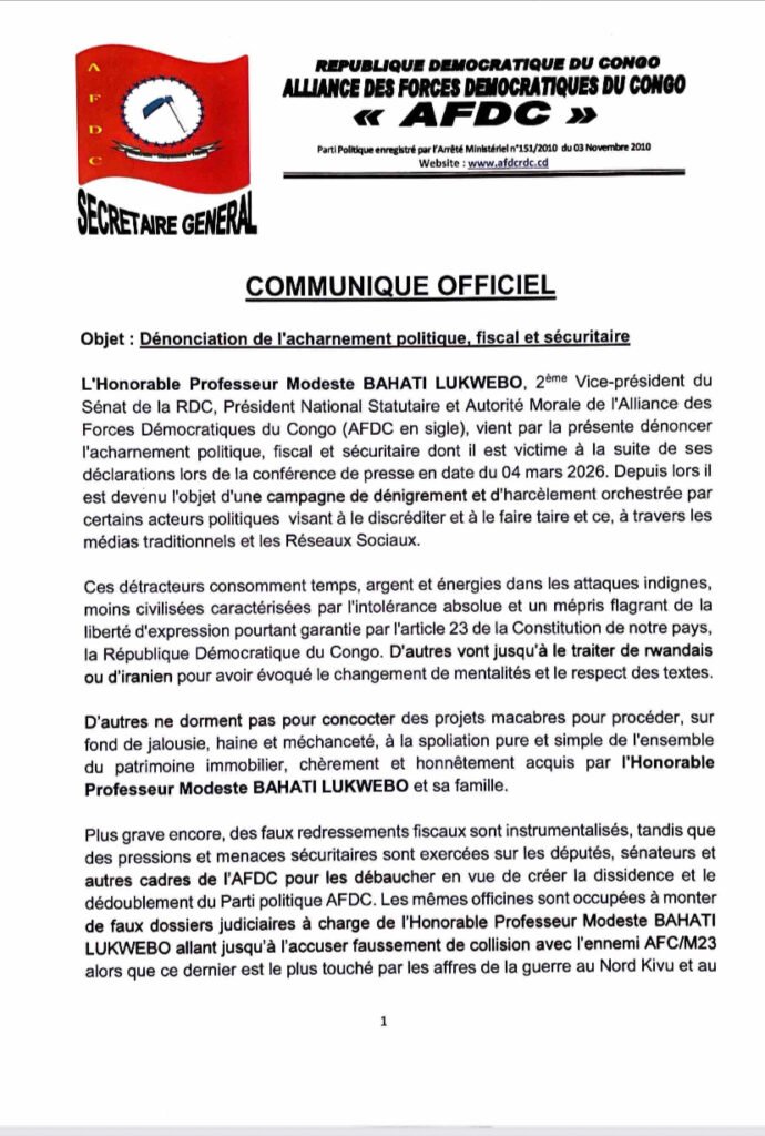 Le communiqué évoque des attaques médiatiques, des menaces sécuritaires, des pressions politiques ainsi que des tentatives de discrédit et de spoliation de ses biens. L’AFDC dénonce aussi la fabrication de faux dossiers judiciaires et rejette des accusations de collusion avec l’ennemi dans l’est de la République démocratique du Congo.