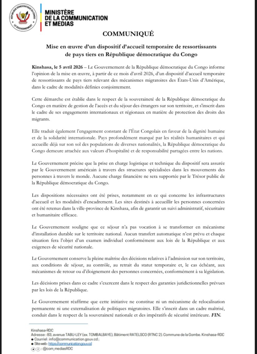 le 5 avril 2026 –Le Gouvernement de la République démocratique du Congo informe l’opinion de la mise en œuvre, à partir de ce mois d’avril 2026, d’un dispositif d’accueil temporaire de ressortissants de pays tiers relevant des mécanismes migratoires des États-Unis d’Amérique, dans le cadre de modalités définies conjointement.