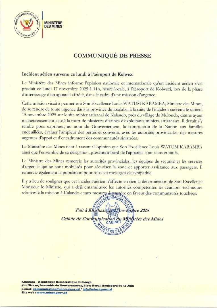 « L’incident n’affecte pas la mission prévue à Kalando après le drame du 15 novembre », précise un communiqué du ministère des Mines.