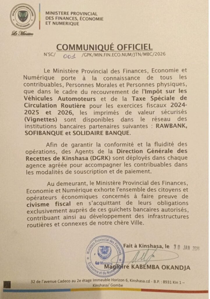 Le Ministère provincial des Finances, Économie et Numérique informe les contribuables que les vignettes relatives à l’impôt sur les véhicules automoteurs et à la taxe spéciale de circulation routière pour les exercices 2024, 2025 et 2026 sont désormais disponibles. Elles peuvent être obtenues exclusivement auprès des banques partenaires, notamment Rawbank, Sofibanque et Solidaire Banque. Des agents de la Direction Générale des Recettes de Kinshasa (DGRK) sont déployés dans les agences agréées afin d’accompagner les usagers dans les procédures de paiement.